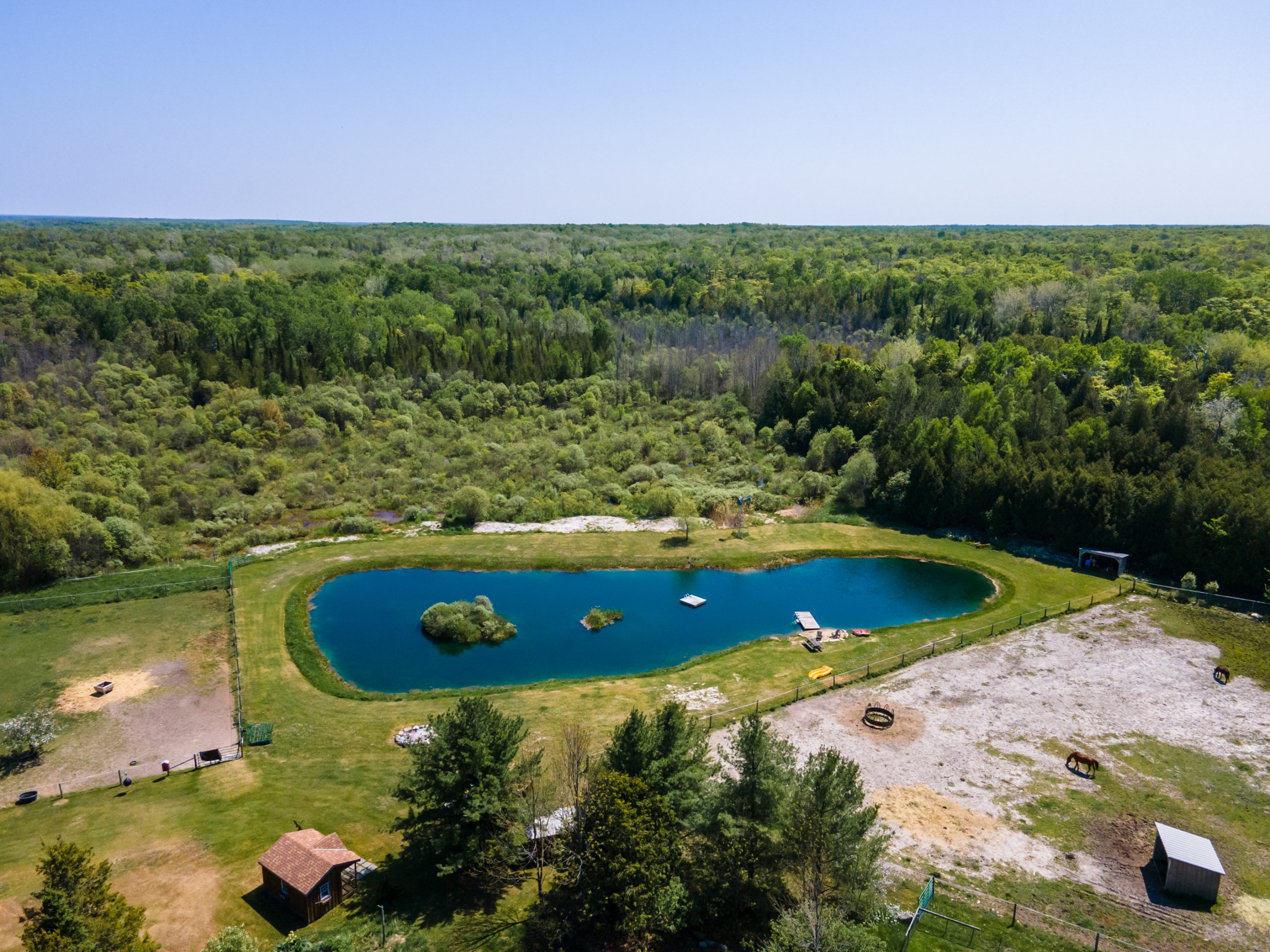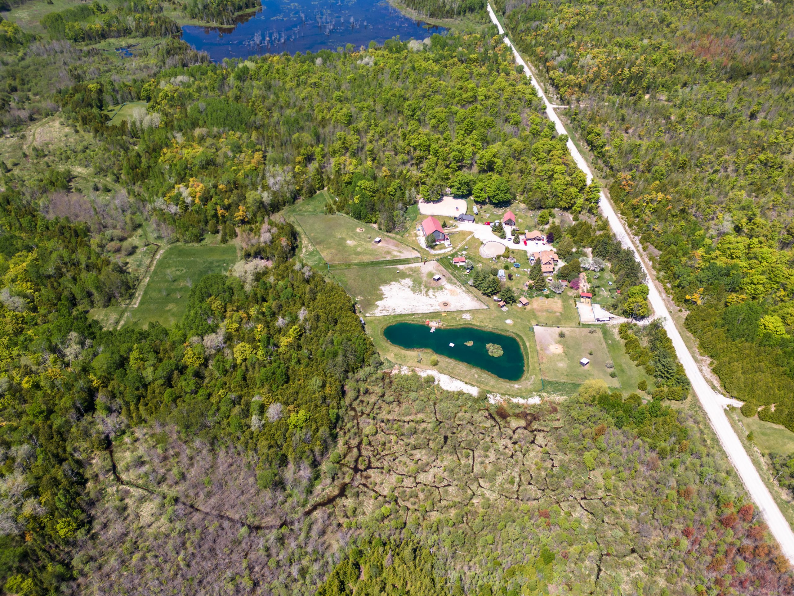 Other : 942 ft. of waterfront on Mille Lake, large swimming pond, recreational trails throughout, bank barn with stalls and hydro, 4 run-in shelters, paddocks, sheds and bunkies, and beautifully landscaped grounds with a greenhouse.